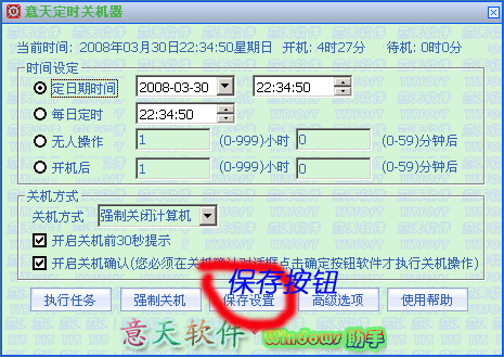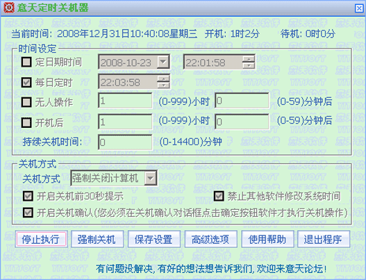 | | |  意天定时关机器是一款Windows操作系统下的定时关机自动关机软件,是家长和办公管理人员的好助手,能满足有各种自动关机控制需求的用户. | |  | | |